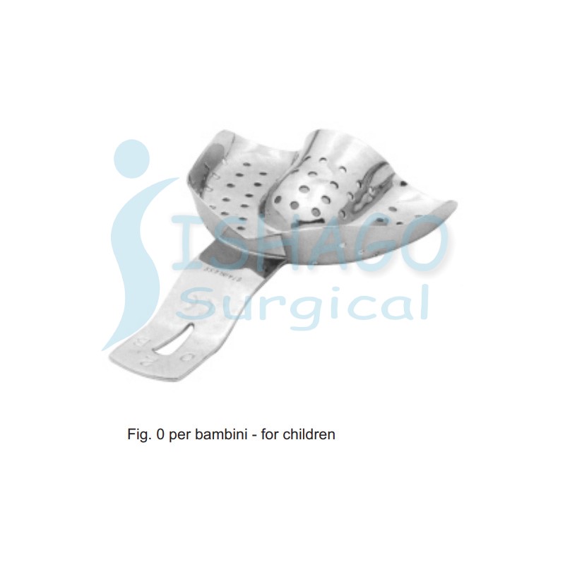 Solid stainless steel anterior depressed impression trays with retention rim.