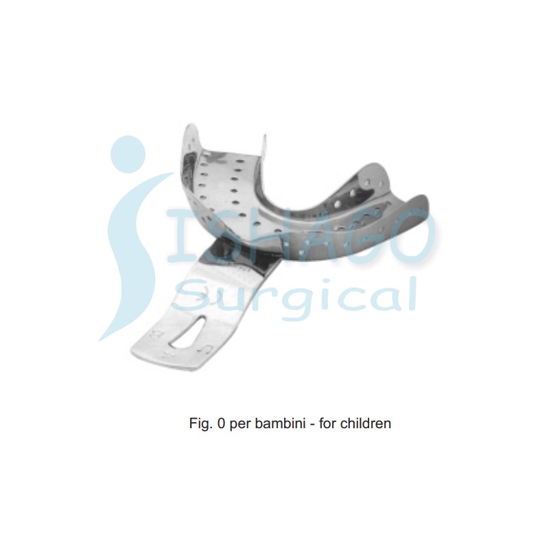 Perforated stainless steel anterior depressed impression trays with retention rim.