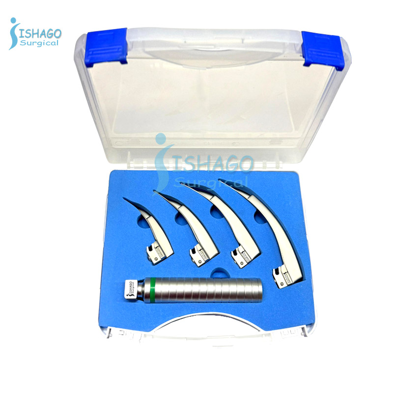 Macintosh Mega Light Integrated Fiber Optic Adult Laryngoscope Set of 4 Blades with Ring Pattern Handle in Transparent Box.